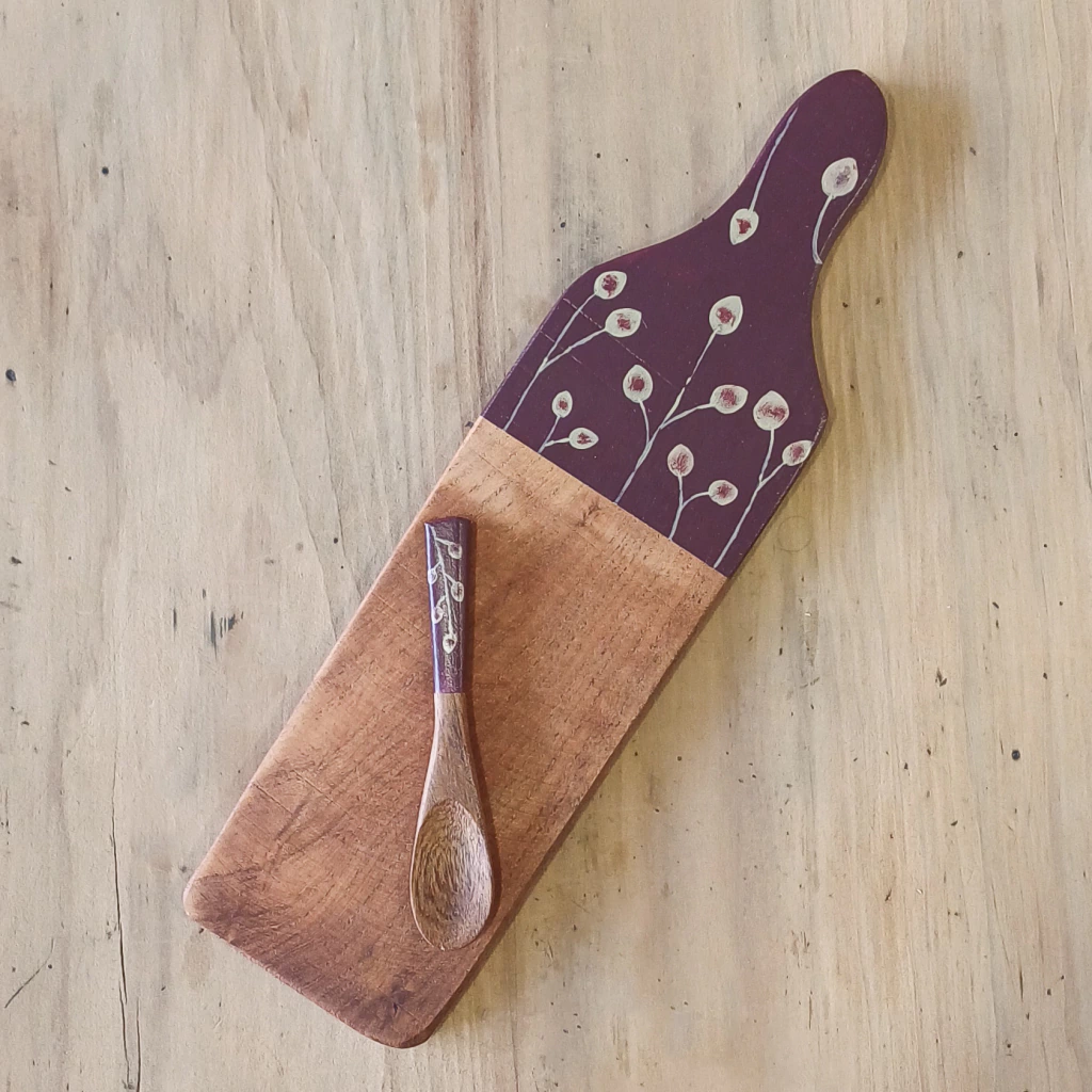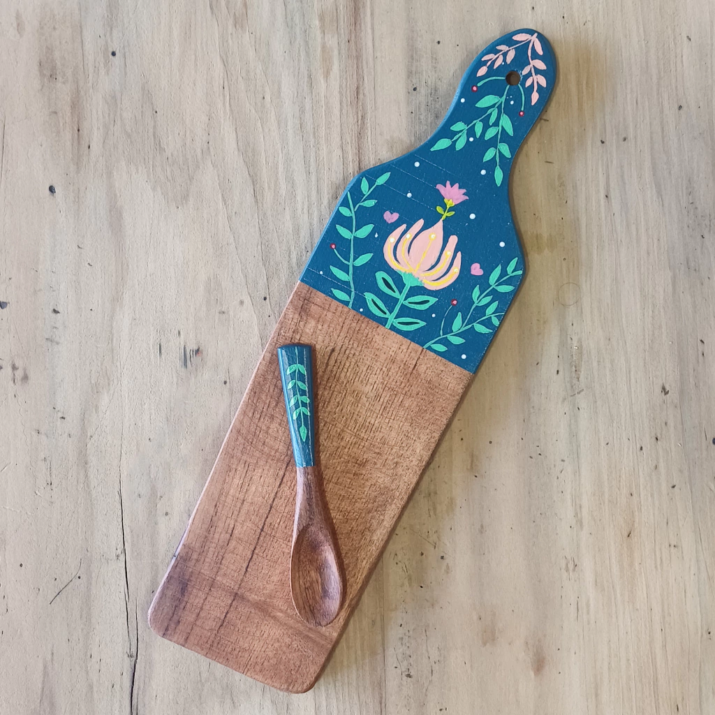 Tabla de cocina confeccionada en madera de algarrobo. Pintada a mano y protegida con cera de abeja. Lista para usar.